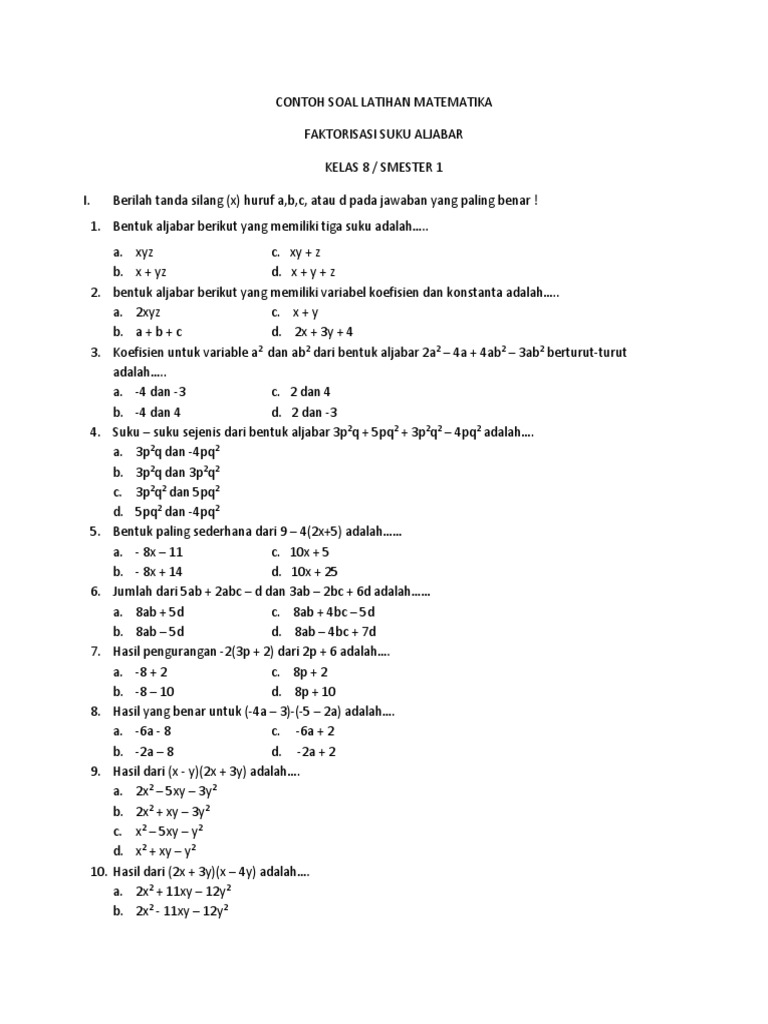 Pemfaktoran distributif pemfaktoran bentuk selisih kuadrat dan pemfaktoran bentuk-bentuk persamaan kuadrat. Berikut ini diberikan contoh contoh soal tentang aljabar lengkap dengan pembahasannya. CONTOH SOAL LATIHAN MATEMATIKA FAKTORISASI SUKU ALJABAR KELAS 8 SMESTER 1 I.