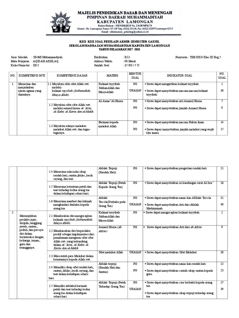 1 KISI-KISI PENULISAN SOAL MATA PELAJARAN KELAS SEMESTER NO STANDAR KOMPETENSI. Penilaian Tengah Semester PTS 2 adalah salah satu bentuk penilaian hasil belajar selama satu semester selain bentuk penilaian lainnya seperti Penilaian Ulangan Harian Penilaian Tugas dan Penilaian Akhir Semester. Prediksi soal uas aqidah akhlak kelas 8 semester 2 kurikulum 2013 dan kunci jawaban ini sekaligus menjawab.