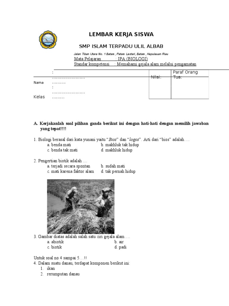 Latihan Soal Biologi Kelas Vii Semester I Doc