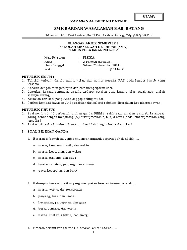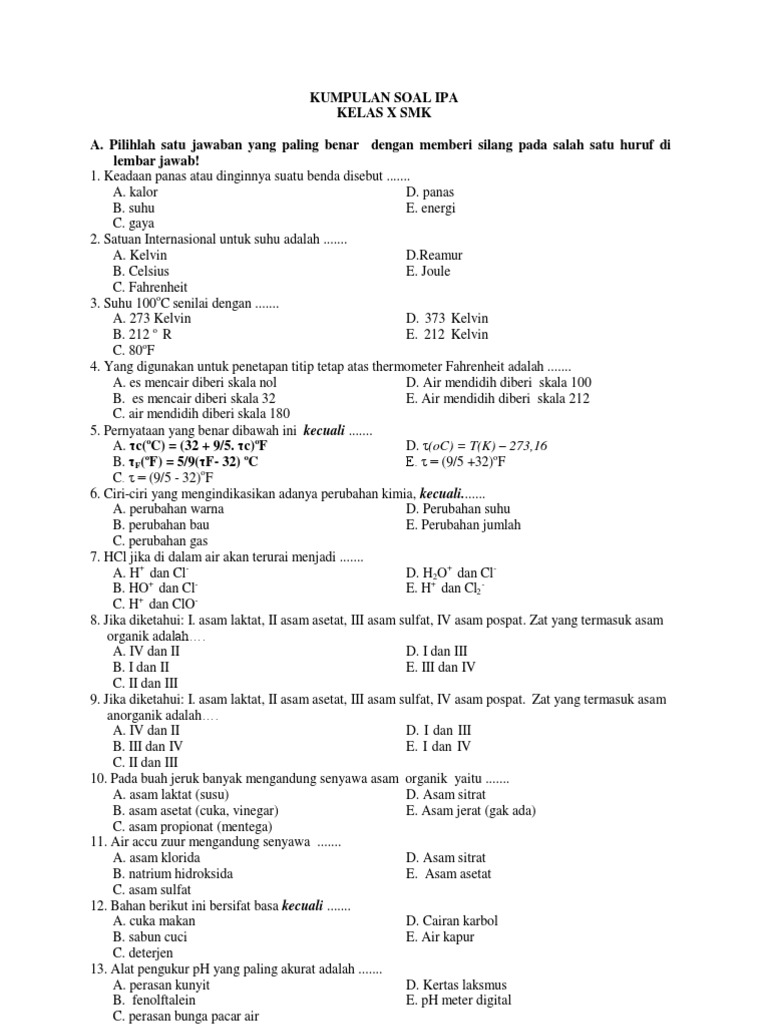 Soal Uas Ipa Kelas 10 Smk Smester 1