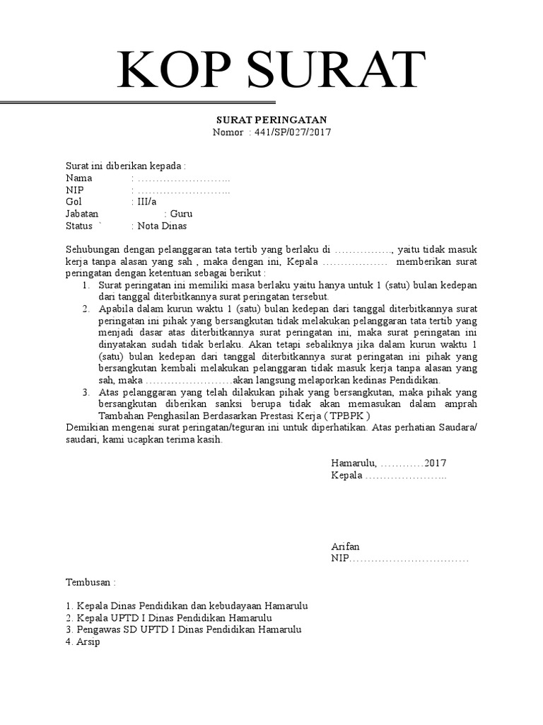 Contoh Surat Peringatan Tidak Masuk Kerja untuk PNS yang dapat di download secara gratis ini sebagai bahan informasi bagi anda yang ingin mengetahui surat peringatan dengan format yang resmi dan profesional. Jadi pimpinan instansi atau lembaga pun tinggal mengisi beberapa bagian yang kosong saja dan melayangkan surat teguran. Diisi dengan tanda.