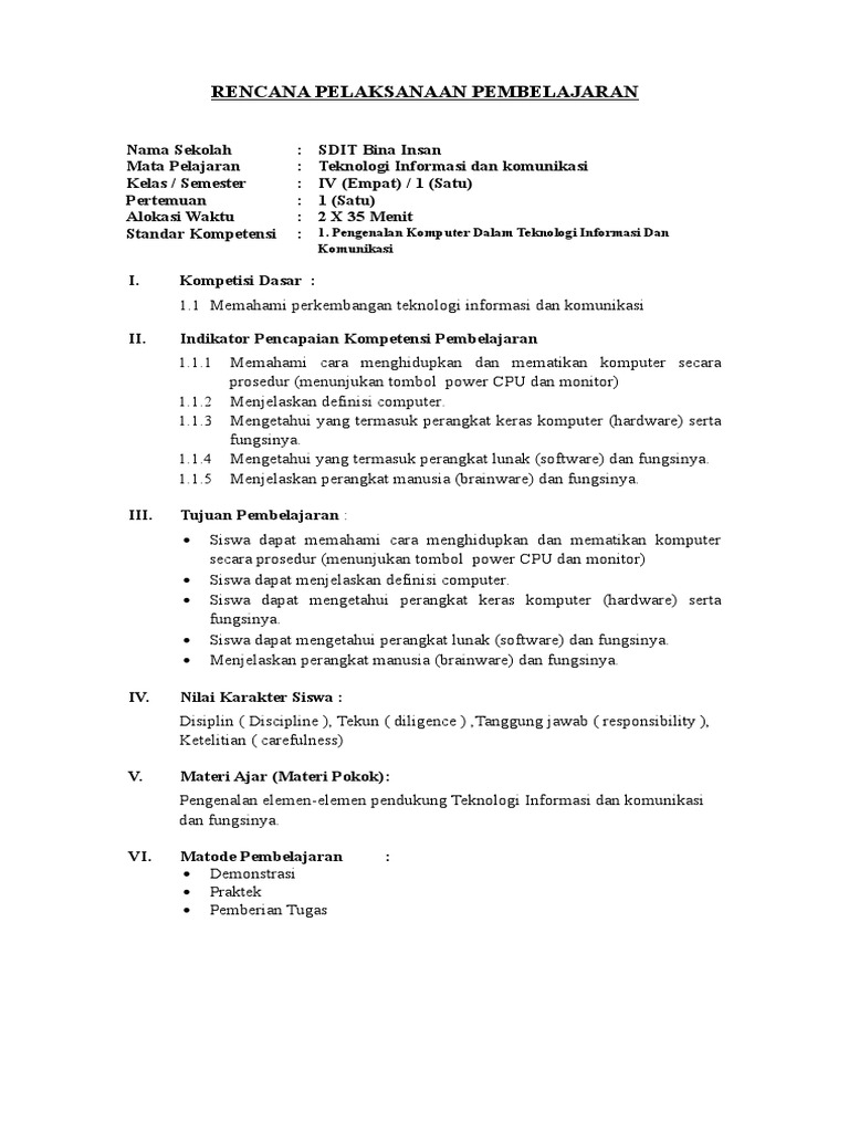 Rpp Teknologi Informasi Dan Komunikasi Sd Mi Kelas 4 6 Soalujian Net