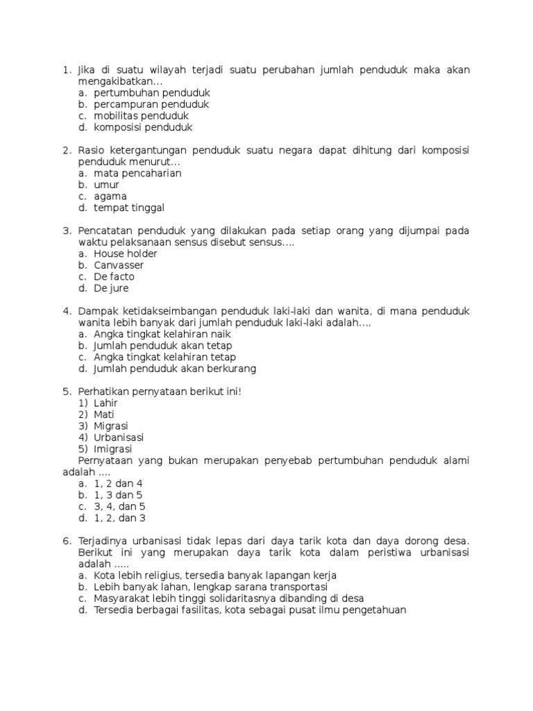 Hai sahabat Ahzaa kita lanjutkan lagi yaa latihan soal IPS SMP MTs nya. Silahkan kunjungi postingan Komposisi Pertumbuhan dan Kualitas Penduduk Materi Kelas 7 untuk membaca artikel selengkapnya dengan klik link di atas. Muttaqin adalah media blog pendidikan yang mengulas tentang agama bisnis pendidikan materi sekolah soal pelajaran dan info menarik lainnya Soal pilihan ganda bab kependudukan dan kunci jawaban Untuk mengetahui keadaan penduduk di suatu tempat dibutuhkan adanya sumber-sumber data tentang penduduk tersebut.