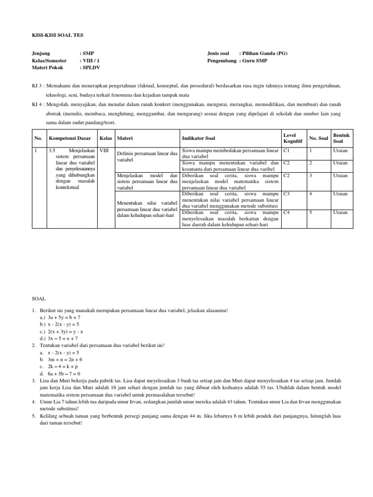 Soal Matematika Smp Sistem Persamaan Linier Dua Variabel Spldv Pdf
