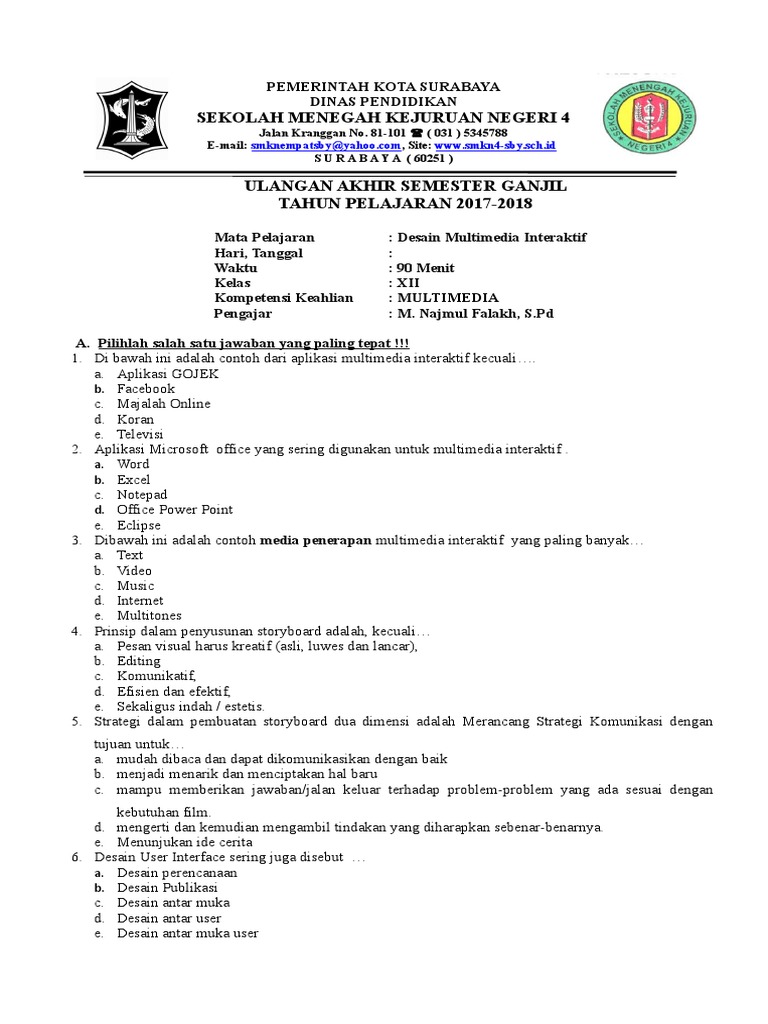 20200831 Contoh Soal dan Jawaban UAS Pilihan Ganda Desain Multimedia Kelas XI Lengkap Contoh soal beserta jawaban pada pilihan ganda desain multimedia kelas 11 2 SMK jurusan multimedia. Desain Grafis Percetakan merupakan salah satu mata pelajaran yang termasuk dalam kompetensi keahlian multimedia yang hanya diajarkan di kelas XI. Kumpulan komputer dalam suatu ruangan c.